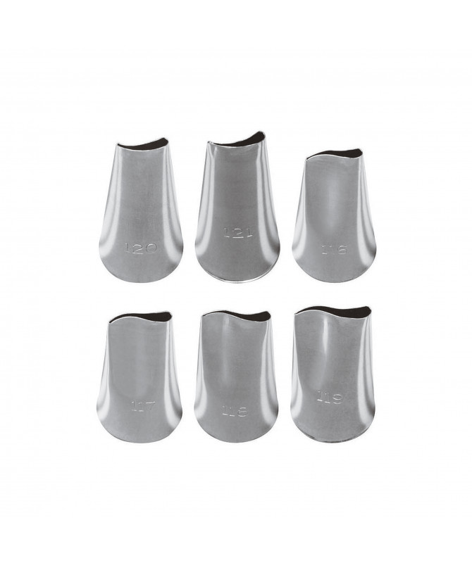 Set di 6 bocchette assortite in acciaio inossidabile per decorare dolci e torte. Le bocchette sono di diverse forme e dimensioni per creare una varietà di decorazioni. Il set è prodotto da Paderno.
