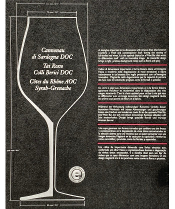 Serie di calici soffiati a macchina, in vetro Sonoro Superiore SON.hyx® senza Piombo, eleganti, fini, brillanti e leggeri: caratteristiche tipiche del vetro soffiato a bocca, ma più durevoli e precisi. La linea VINEA™ è caratterizzata da un design affascinante coniugando le forme classiche con quelle moderne e funzionali. Questa collezione è dedicata ai vitigni autoctoni più importanti del territorio Italiano. I calici sono stati studiati attraverso ricerche correlate da diversi tentativi e quindi testati con il Big Sensory Test® Avanzato e il Big Sensory Test® Analogico-Affettivo del Centro Studi Assaggiatori per caratterizzarli. I calici VINEA™ esprimono in modo ottimale le caratteristiche sensoriali di ogni singolo vitigno esaltandone le qualità organolettiche. Le forme della collezione VINEA™ fanno la differenza rispetto a tutti gli altri calici sul mercato: il vino contenuto in questi calici provoca una “esplosione” di bontà del territorio di provenienza attenuando il contenuto alcolico nell’aroma. Rende quindi piacevole il vino allo stesso modo sia ai conoscitori esperti che ai principianti: Taste the Difference. Le forme e dimensioni dei calici sono tali da: • Attenuare la percezione del contenuto alcolico amplificando gli aromi propri del vitigno. • Equilibrare le sensazioni gustative e tattili del vino con ottimo “mouthfeel”. • Rendere la percezione aromatica intensa ed equilibrata. • Conferire al vino una aerazione lenta e profonda senza modificare gli aromi propri. Infatti, i nostri recenti studi e ricerche sui calici VINEA™ hanno ancora una volta confermato che il vino modifica il proprio sapore ed aroma in base alla forma e dimensione del calice con cui si beve. In particolare, nella coppa dei calici, la diffusione degli aromi avviene ad “Anello”, vale a dire che l’alcool si concentra verso l’esterno mentre all’interno (parte centrale della coppa) si diffondono maggiormente gli aromi propri del vino. Questo fenomeno riscontrato nei calici VINEA™ esalta il sapore del vino e i relativi aromi senza alcuna interferenza con l’etanolo gassoso. L’etanolo gassoso condensa in parte sulle pareti della coppa ed in parte fuoriesce verso il bordo del calice senza influenzare l’esame olfattivo.